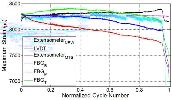 Two additional experiments were conducted under constant strain, but this time using an extensometer mounted on the specimens until the failure, where the pertinent specimens are denoted with E1 and E2. Similar to the results obtained from experiments with LVDT control, the decrease in the maximum strain values is also noted for both E1 and E2, wherein FBG strains experience distinctive phases during the fatigue loading process.