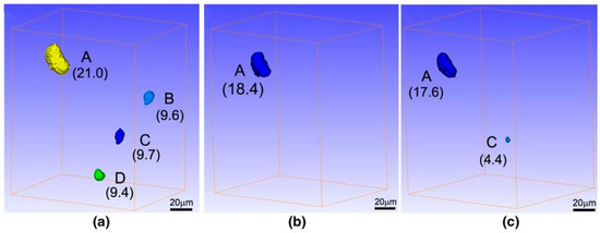 XRT volume renderings of micro-pores in a same sample with a heat treatment at 1603 K for (a) 0 h, (b) 1 h, (c) 4 h, (d) 7 h, (e) 12 h, and (f) 20 h. The equivalent diameter (μm) of the S-pores is also given [118].
