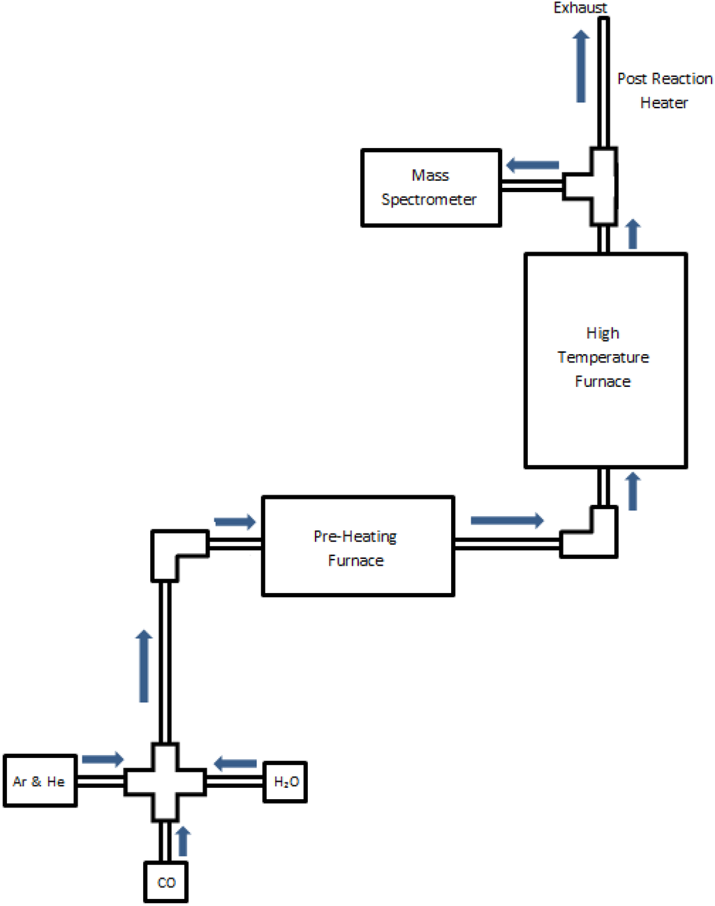 A laboratory-scaled reactor was used for precise control and monitoring of the iron-steam oxidation reaction and reduction processes during single cycle and multi-cycle tests. The flow of all gases was controlled by mass flow controllers (Alicat Scientific), and the reactor temperature was controlled and monitored by SentroTech (stt-1700C-1.5-18; stt-1200C-2-12) tube furnaces. All experiments were conducted using a constant surface area monolith, as created using 6.35 mm O.D. elemental iron rods (Surepure, 99.5% Fe) at a fixed length of 30.5 cm. The stt-1200 furnace was used to preheat the carrier gases as well as for steam generation, with the liquid water supplied precisely via a syringe pump (BASi). The water was supplied by a 1.59 mm I.D. stainless steel tube coiled within a 12.7 mm I.D. stainless steel situated within the furnace test section. The annular tube had inert gas flows of argon and helium, into which the steam is injected at the exit of the steam tube coil. The gases (steam and inert gases) are preheated to a temperature of 750 °C, and then flow through a heated transfer section into the main reactor furnace. The inert gases allow for the variation of concentration, and for quantitative monitoring of the reactor output by a quadrupole mass spectrometer (MS) (Hiden model HPR-20). To create the annular reactor space test-section, the iron test rod was positioned axially within a 12.7 mm I.D. tube (705 Inconel) that was situated within the stt-1700 furnace test section. Control experiments with no iron monolith showed no hydrogen production from the Inconel housing. Thermocouple probes were used to both calibrate and validate the reactor test bed temperature against the furnace controller settings. The reactor temperature was then assumed representative of the substrate reactive layers under reacting conditions, given the significant thermal inertia of the iron monolith. During the oxidation phase experiments, the iron and the steam in the gas flow react to form an iron-oxide layer and release hydrogen, as described in detail in a recent publication []. During the chemically-assisted reduction experiments, the steam flow was terminated, and CO was introduced into the gas flow to react with the iron-oxide layer. During redox cycling experiments, the flow of the gases and the steam was set and controlled through a LabView VI that was connected to the flow controllers and syringe pump such that the timing was consistent on a cycle-to-cycle basis. A schematic of the reactor can be seen in Figure 1.