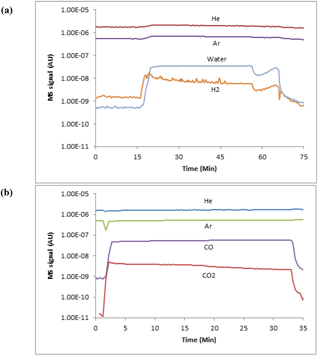 During each experiment, the output gas species concentrations were quantified using the MS, with all gas sampling accomplished via a heated quartz capillary tube. The MS was directly calibrated, and all experimental data were reduced using the flow of argon as an internal standard. The calibration was done using a series of known gas flow rates and mixtures without a reactive sample present; the signal ratio of each gas to argon was then used to build a calibration curve. In addition, the known Ar/He ratio was used to validate each experimental run for additional quality control. Finally, all hydrogen signals were corrected for water fragmentation based on a direct calibration using the current MS detector settings and relevant steam flow. Figure 2 shows typical MS readings for an initial oxidation and reduction cycle.