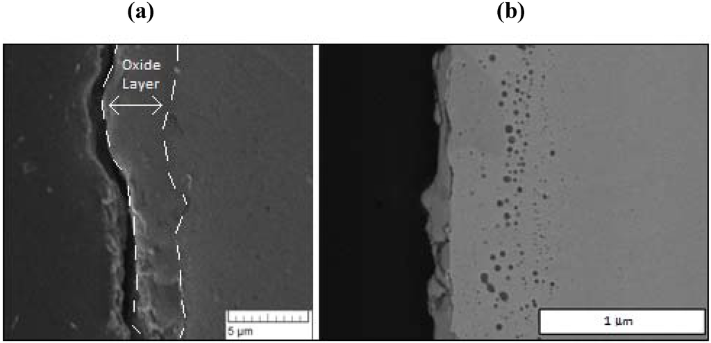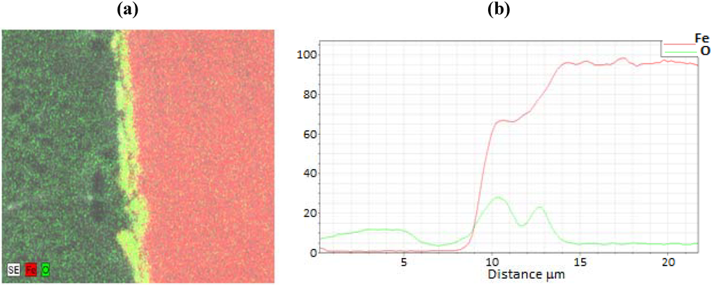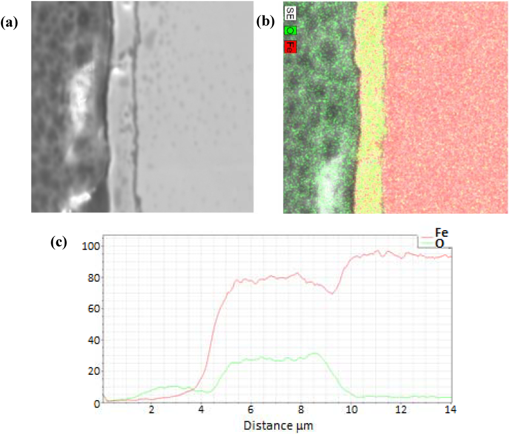 From these typical images, the general structure of the oxide layer and its approximate thickness are readily observed. After repeated experimentation, the oxide thickness revealed considerable variability from run to run, as well as around the perimeter of a given specimen. For all experiments, the average over all samples (N = 21) was found to be 5 microns with a standard deviation of 3 microns. As discussed in our previous study [], the large differences are attributed primarily to either spallation of the oxide layer or to fracture during polishing. While the EDS data profiling is discussed below, these films are considered primarily as magnetite, Fe3O4, based on previous EDS and Raman spectroscopy [].