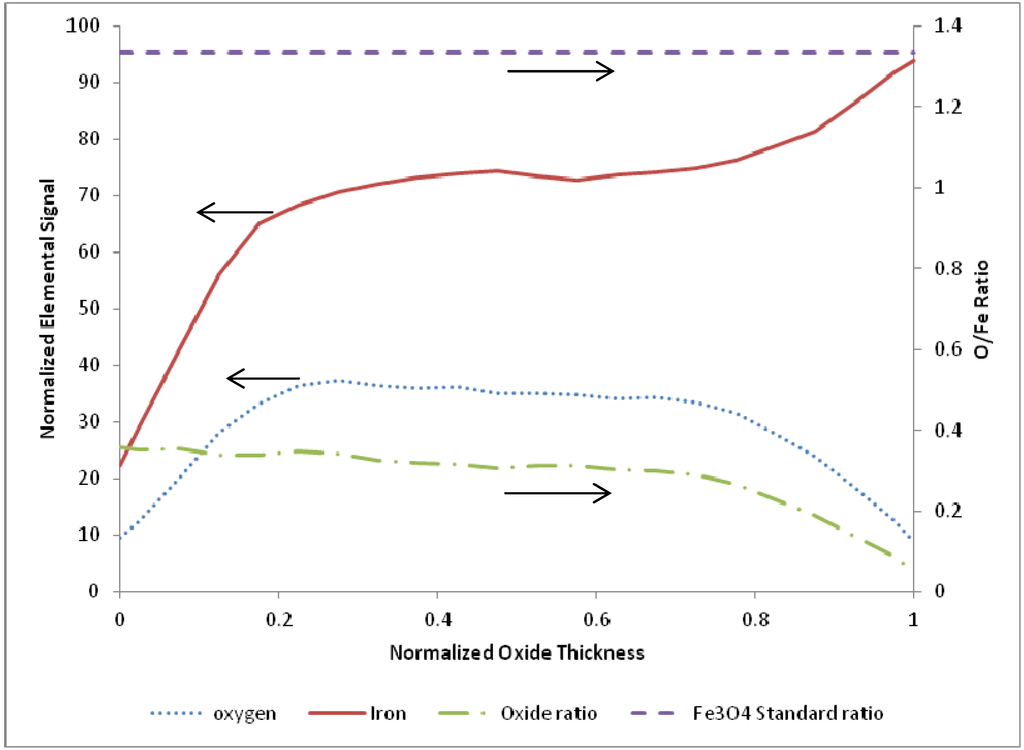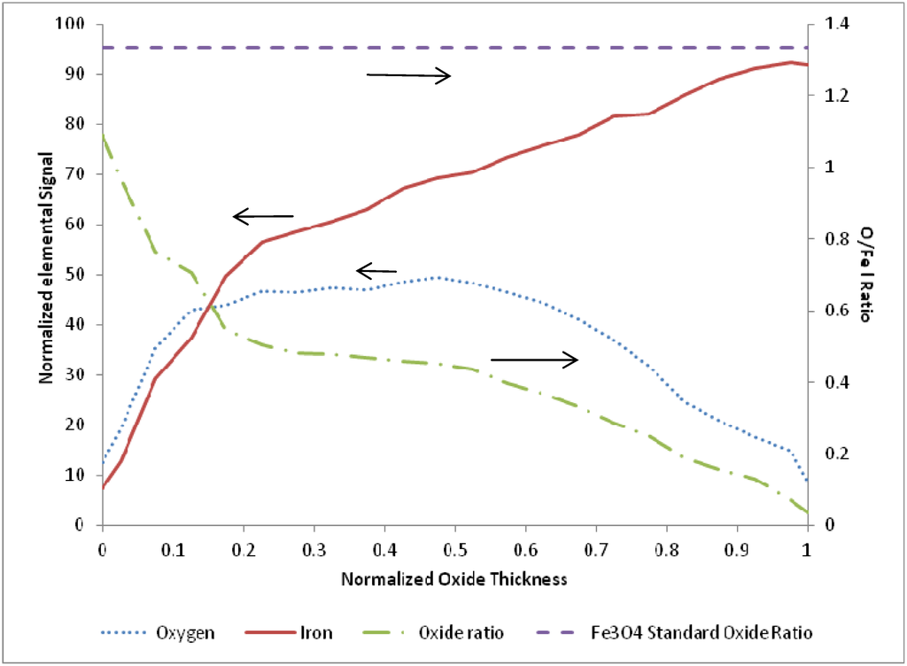 After examination of the oxidation terminated SEM and EDS data over the entire temperature range of 675 to 875 K, there was no clear trend observed with temperature or cycle number. Therefore, the oxidation sample normalized line scans were pooled and averaged (N = 11) to produce a representative O/Fe profile. The resulting average species profiles are presented in Figure 5. Several interesting findings are noted in the average oxidation terminated profile. First, the O/Fe atomic ratio is very near the stoichiometric ratio for Fe3O4 at the outer surface, and decays monotonically to a near-zero atomic ratio at the inner oxide/bulk iron interface. Such a quantitative profile of the oxide ratio is consistent with our previous findings of magnetite at the surface via Raman spectroscopy, and of an O/Fe gradient consistent with a diffusion model based on a Cabrera-Mott kinetics mechanism []. As the oxide layer grows, there is diffusion of oxygen and iron species, resulting in a continuous gradient and non-stoichiometric iron oxide throughout the length of the oxide layer. This finding stands in contrast to conceptual models based on uniform, idealized stoichiometric (e.g., Fe3O4) oxide layer growth.