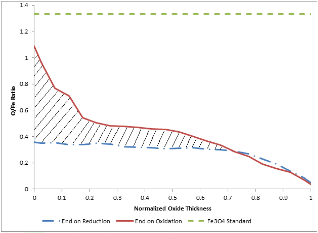 As discussed in the motivating comments above, a successful water-splitting process using a reactive metal redox cycle must operate efficiently over many (e.g., thousands) of redox cycles. We note in this study and in our previous work that iron oxide, namely Fe3O4, spalls due to structural incompatibilities between the bulk and oxide states, and appears to be most stable at a layer thickness on the order of 5 to 10 µm. Given the equilibrium thermodynamics of the various iron oxide states [,,,], combined with the physical morphology and stability of the oxide layers, the ability for total (i.e., complete) stoichiometric reduction will be difficult to achieve in any practical reactor with high surface-to-volume ratios (e.g., fine grain powders) and rapid cycling times. Considerable attention has been given to reactor design for iron-based redox systems, although the role of resulting oxide film structures, as related to oxidation and reduction kinetics has been somewhat overlooked []. To gain additional insight into this important facet of hydrogen production via iron redox systems, we present in Figure 8 the average O/Fe atomic profiles obtained for our oxidation-terminated and reduction-terminated oxide films.