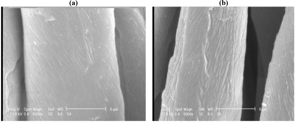 Figure 4 displays SEM micrographs of untreated and laser treated cotton fabrics at magnifications of 5,000, 10,000 and 15,000. It can be seen that laser treatment of cotton fiber caused some gaps and cracks on the fiber surface. Figure 5 shows the micrographs of cotton fabric treated with silver nanoparticles, the EDAX analysis was obtained from the SEM micrographs (Table 2). The untreated cotton fabric showed 4.34% of silver ion content whereas laser treated cotton fabric showed 5.25% of Ag ions. Energy dispersive X-ray spectroscopy (EDAX) is an analytical technique used for the elemental analysis or chemical characterization of a sample. The EDAX analysis is not an accurate method for determination of silver ion amounts, and it is better to use ICP-OES (Inductively Coupled Plasma Optical Emission Spectroscopy) analytical method for the analysis.