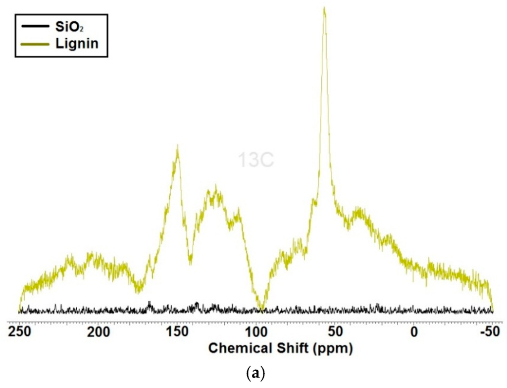 In conclusion, analysis of the 13C CP MAS NMR spectra fully confirmed that the synthesis of the lignin–silica hybrid filler had been performed successfully.