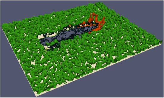 The simulation domain size is 400 m by 320 m by 600 m (x vs. y vs. z) for all cases. The grid resolution is 2 m by 2 m by 12 m in x, y and z directions respectively. The vertical grid is much finer close to the ground surface and is stretched towards the top so the canopy is resolved in high resolution. The average grid size in the canopy layer is 1.8 m. The time step is 0.02 s. Thus the number of grid points in each direction is 200 by 160 by 50. The number of processors used in x and y direction are 10 and 8, overall 80, to parallelize the simulations with MPI (Message Passing Interface). All simulations were run until 30,000 iterations (600 s or 10 min). Each of the simulations were run for 3100 s to sufficiently develop the inlet turbulent wind fields. Periodic boundary conditions were used at the inlet and outlet of the domain. A wind profile with a value of 8 at 30 m above ground level was prescribed, which adjusts to the presence of the vegetation during the up spin up simulations for the wind. The domain top was prescribed with a free slip boundary condition. The fire simulations were started after the wind runs with a 4 m wide and 80 m long ignition line, which was 80 m offset from the inlet domain. A target ignition temperature of 1000 K was reached with a ramp rate of 350 K s−1. The vegetation data used is real canopy structural data in three dimension collected by the US Forest Service (USFS) Rocky Mountain Research station (RMRS) for a 20 m by 50 m area for ponderosa pine. This tile of vegetation distribution is used in a random pattern as shown in Figure 2. The fraction of the tree canopy shape that is concave downwards is 0.8 (standard for ponderosa pine). This corresponds to the leaf area density shape, namely how high are the branches off of the ground. The average density for tree canopy (fine fuel) is 0.4 for ponderosa pine as suggested by the USFS []. The fuel loading values are representative of longleaf and loblolly pines in the US Southeast and ponderosa pines in the US southwest [,,] and therefore the results should be applicable for a wind range of conditions in coniferous forests. Note that for all cases, a 40 m open space is left to allow the wind to equilibrate. The full domain is populated by grass and litter at the ground level, while the open grassland grass density is 0.4 and the open grassland grass height is 0.7 m. Below the canopy, grass density should be less because of canopy shading and this is accounted for by using an exponential attenuation factor of 5.0 []. The estimated maximum litter density within the fuel bed is 5.0 and estimated maximum litter height is 0.1 m. An exponential factor of 5.0 is used to enhance the litter density because of canopy shading. The nominal fuel moisture for canopy is and for grass and litter. The nominal fuel size scale is 0.5 mm. Maximum tree height in all cases is 19.9 m.