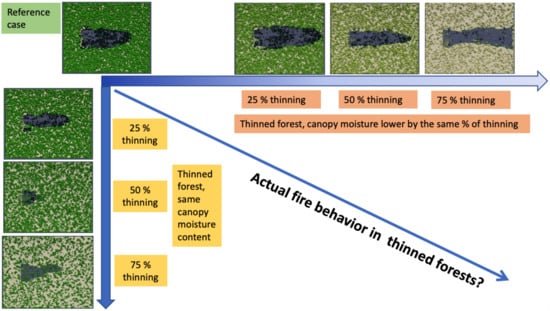 - Banerjee, T.; Heilman, W.; Goodrick, S.; Hiers, K.; Linn, R. Effects of Canopy Midstory Management and Fuel Moisture on Wildfire Behavior. 2019. Available online: https://osf.io/4p57h/ (accessed on 20 April 2019).