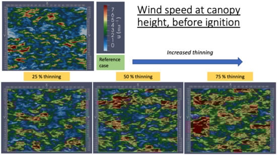 Figure 3 shows the instantaneous wind speeds at canopy top at the reference case and three different thinning levels before fire propagation using a colormap. The flow fields are highly turbulent and red and yellow streaks show zones of higher gustiness, whereas green and blue streaks show lower magnitudes of wind speeds. Evidently, the proportions of yellow and red streaks increase with higher degrees of thinning. This indicates that wind speeds are indeed higher at thinned forests which is consistent with several studies discussed earlier.