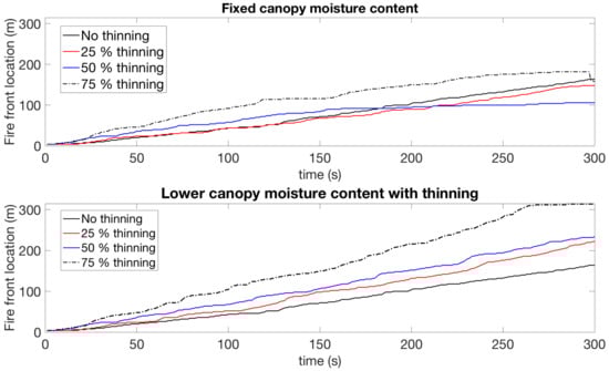 On the other hand, reduction of canopy fuel moisture along with thinning increases the rate of spread significantly compared to the reference case and the fire front progresses at a faster rate compared to the cases with no change of canopy moisture content. The difference between the spread rates at the different thinning levels are also more prominent when reducing canopy moisture with thinning.