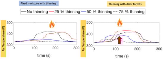 Figure 5 shows the time series of (potential) air temperature sensed by a virtual sensor placed at 15 m height at domain centre. Note that the location of the virtual sensor at 15 m is close to the canopy top. The left panel shows the cases with different degrees of thinning with no change in canopy moisture content, while the right panel shows the same with canopy moisture loss with increased thinning. The air temperature increases as the fire front comes close to the domain center. It is interesting to note that the air temperature almost reaches the same magnitude for the 25% thinning compared to the reference case, when there is no change in canopy moisture. The 50% and 75% thinning cases record a much smaller temperature increase without any canopy moisture change. When canopy moisture is reduced with thinning, the 25% thinning case actually records a higher temperature than the reference case. Moreover, even the 50% and 75% cases record a significantly increased air temperature when the moisture is reduced. This increase of air temperature at lower moisture contents is highlighted with a red arrow.