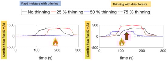 Figure 6 shows the turbulent sensible heat flux recorded at the same virtual sensor at 15 height at domain center for the different simulation scenarios. Similar to Figure 5, the left panel shows the cases where canopy fuel moisture is fixed and the right panel shows the cases where canopy moisture is reduced as well. The sensible heat flux is computed as the covariance of the turbulent vertical velocity fluctuations and the air temperature fluctuations. This can be taken as the heat pulse the canopy would experience from below as the fire propagates and thus a good indicator of crown damage. Moreover, the sensible heat flux contains the combined effects of wind speed and heat generated due to combustion. It turns out that at 25% thinning level without changing canopy moisture, the sensible heat flux is almost similar to that recorded by the reference case. The 50% and 75% cases record a low amount of sensible heat flux without canopy moisture change. When canopy fuel moisture is reduced along with thinning, the sensible heat flux at 25% thinning is significantly higher compared to the reference case. Even the 50% and 75% cases a significant increase of sensible heat flux when canopy fuel moisture is reduced with thinning. Note that the sensible heat flux can increase with higher turbulence demonstrated by stronger fluctuations in the vertical wind velocity as well as the increase of the potential temperature fluctuations. The augmentation of sensible heat flux due to fire front propagation is also indicated with an arrow in Figure 6.