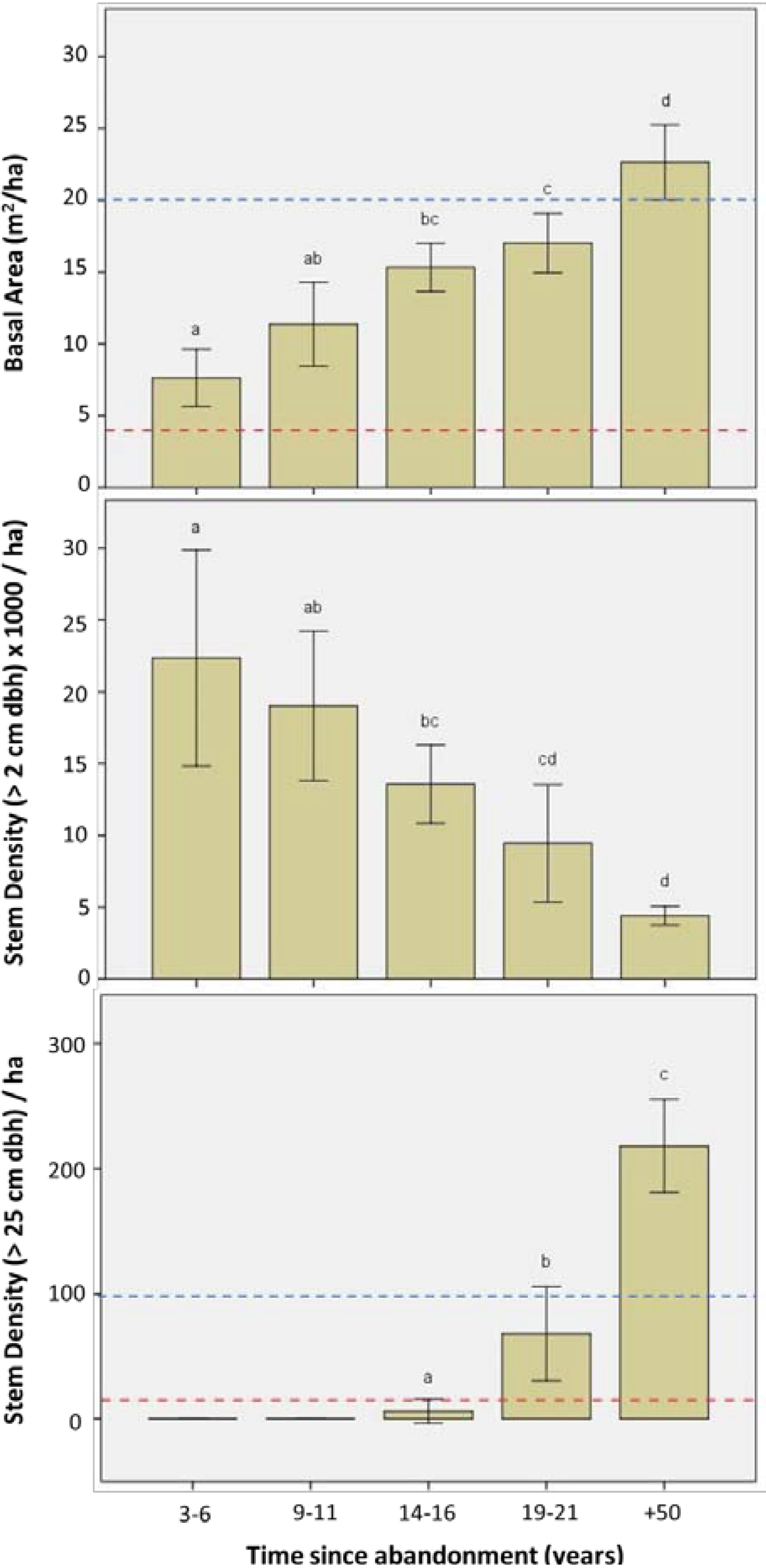 Basal area and stem density in forest stands of Southern Yucatan, with abandonment times ranging from 3 to >50 years. The red dashed lines represent the current reference values established by the regulation of the Law for Sustainable Forestry Development (LSFD), whereas the blue dashed lines represent accurate science-based reference values. The different letters placed above the error bars indicate statistically significant differences (analysis of variance (ANOVA), Tukey’s test, p < 0.05).