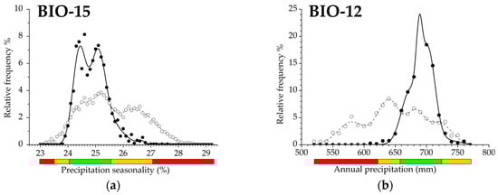 We selected 17 temperature and precipitation indices from the BIOCLIM series corresponding to various time scales and definitions, e.g., monthly minimum, quarterly mean, annual variation [,]. We also used four ecologically powerful composite variables to emphasize temperature (e.g., Thermicity = Ti) and precipitation (e.g., Summer Drought Stress = SDS) variability or limitation in this transitional distribution zone. Moreover, six mixed composite indices (e.g., temperature and precipitation ratios) also proved to be useful to detect humidity-related climate function of the distribution (e.g., Compensated Summer Ombrothermic index = CSOi). Overall, 27 bioclimatic variables were used in the analyses (Table 1). The calculation methods of composite indices are presented in Equations (1)–(10).