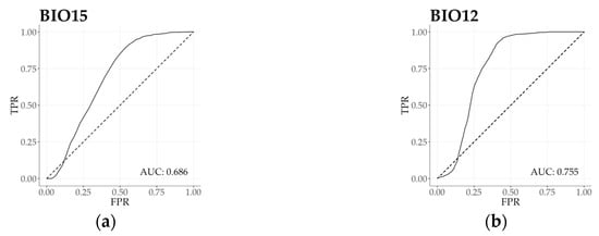 (a–f) ROC curves with AUC estimation (Receiving Operating Characteristic curve with Area Under the Curve) of beech forests for selected variables corresponding with climatic traits in Figure 3. (a) Precipitation seasonality (BIO15); (b) Annual precipitation (BIO12); (c) Mean temperature of the coldest quarter (BIO11); (d) Continentality (Ci); (e) Annual mean temperature (BIO1); (f) Isothermality (BIO3). Solid line indicates beech forests function and dashed line indicates random area value of the geographic region as the reference (AUC = 0.5). FRP = False Positive Rate, TRP = True Positive Rate. For ROC curves and AUC values of additional variables see Figure S2.