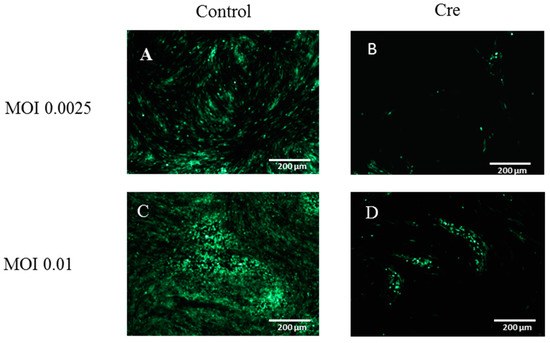 Cre-Lox has previously been used to remove the BAC sequence from recombinant duck enteritis virus [8,17]. However, the optimal condition for the Cre-Lox mediated excision has not previously been determined. In order to remove the GFP indicator, CEF cells were transfected with pcDNA3-Cre plasmid (Figure 4B,D) or the control plasmid (Figure 4A,C). 24 h post transfection, CEF cells were infected with DEV-GFP-HA virus at either MOI 0.0025 (Figure 4A,B) or MOI 0.01 (Figure 4C,D). 48 h post infection, virus was harvested and used to infect CEF cells. The ratio of GFP positive/negative colonies was calculated, which showed greater than 50% of GFP cassette was removed from the DEV-GFP-HA virus genome when infected at MOI 0.01, while only around 28% was removed when lower MOI 0.0025 was used (Figure 4E).