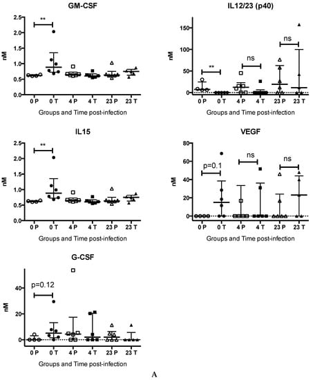 Evaluation of plasma inflammatory mediators in chloroquine treated (T, black symbols) versus non-treated (Placebo, P, open symbols) animals before infection (0P, 0T), and at 4, 23 days post-infection. Macaques were treated with chloroquine five days, and then were inoculated with 100 AID50 of CHIKV (day 0). Plasma grow-factor, cytokines and chemokines induced by the CHIKV infection were assayed using Luminex assays at day 0 before infection, four days post infection, and at day 23 post-infection thus 13 days after resolution of chloroquine treatment (see material and methods). (A) Chloroquine treatment induced variation in the expressed cytokines and chemokines: GM-CSF, IL-15, G-CSF, IL-12/23 (p40), and VEGF. Kruskal-Wallis then M&W test, ** p < 0.01, ns: not significant; (B) Cytokines significantly increased after infection (all p < 0.001: IL-6, MCP-1, IL-8, IL-10, IL-18, IL-1RA, IFNγ; in chloroquine treated (dark symbols) versus non-treated (open symbols) animals. Comparison between groups: Kruskal-Wallis then M&W test, ** p < 0.01, * p < 0.05; $ p < 0.07, ns: not significant.