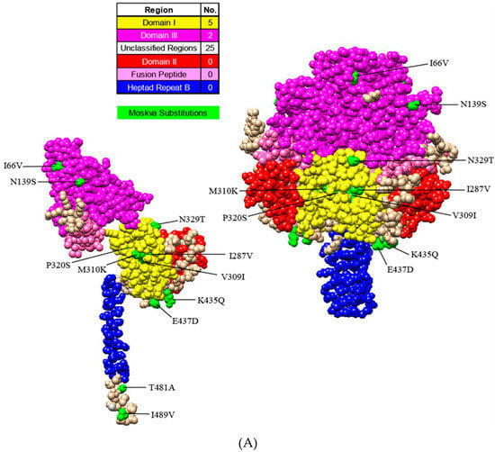 The PIV5 genome encodes two glycoproteins, F and HN, which are essential for viral attachment, fusion, and entry. With Moskva exhibiting human origin, the F and HN amino acid sequences of Moskva were compared to the F and HN of human strains. The protein models illustrated the location and magnitude of substitutions using SWISS-MODEL (Swiss Institute of Bioinformatics, Lausanne, Switzerland; F, 4jf7.1; HN, 4wsg.1), Phyre2 (Imperial College London, London, UK; F, c2b9bA; HN, c4jf7B), and Chimera (Resource for Biocomputing, Visualization and Informatics, University of California, San Francisco, CA, USA). Consistent with Moskva’s evolutionary divergence, the F and HN proteins of Moskva had more residue substitutions (32 and 31, respectively) relative to consensus sequences of human PIV5 strains (Figure 3A). Of the 32 Moskva F protein substitutions, the majority of the substitutions (n = 25) occurred in unclassified regions of PIV while 5 and 2 substitutions occurred in domains I and III, respectively [,]. Domain II (including the hydrophobic loop), the fusion peptide, and heptad repeat region B (HRB) lacked residue substitutions in Moskva [,]. The hydrophobic loop plays a crucial role interacting with the HN protein for fusion activation, and the region is conserved in all the strains of Paramyxoviridae [,]. In the HN protein, the stalk was more conserved than the head, with 23 residue substitutions in the head versus only two substitutions in the middle of the stalk (Figure 3B). The stalk interacts with the F protein for fusion, and residue substitutions in the stalk near the head of the protein are less detrimental than those substitutions further from the head of the protein []. Alterations in the F and HN glycoproteins further represented the divergence of Moskva while supporting regions of conservation.
