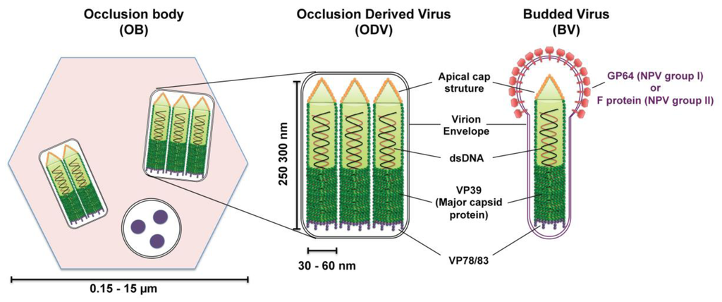 Most baculoviruses produce two types of infectious viral particles: the budded virion (BV) and the occlusion-derived virion (ODV) (Figure 2). While all four genera of baculoviruses form ODVs, only Alpha-, Beta-, and Deltabaculoviruses generate BVs []. The two forms of virions are produced at different times and subcellular places during the replication cycle. BVs are produced during the initial replication when nucleocapsids bud from infected cells and obtain their envelopes from the plasma membrane. Thus, BV contains a single nucleocapsid and a plasma membrane-derived envelope, which contains the viral fusion proteins (GP64 or F protein). ODVs are produced during the very late phase of replication and are formed in the nucleus by envelopement of a single or multiple nucleocapsids per virion, which then become incorporated within the protein matrix (polyhedrin for NPVs or granulin for GVs) forming OBs that are released into the environment upon death of the infected larva. While ODV is involved in virus transmission between insect larvae by infecting midgut cells of feeding caterpillars, BV is the infectious form responsible for cell-to-cell transmission within the host and in cell culture (reviewed in []).
