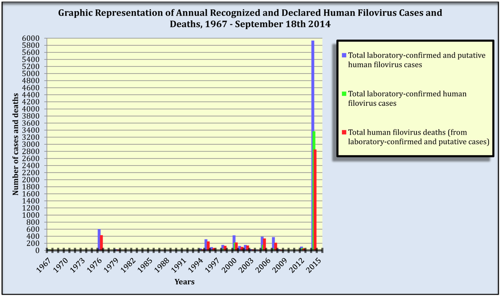 Annual recognized and declared filovirus-disease cases and deaths in humans, 1967–18 September 2014. Note: Biosafety level-4 laboratory accidental filovirus exposures are included as they involve human cases. Filovirus-disease cases and deaths from outbreaks that occurred over multiple years are assigned to their first year of occurrence. Data source: Table 1.