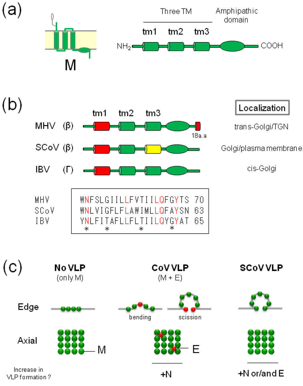 The Golgi retention domains of IBV-M and MHV-M, which accumulate primarily in the Golgi complex, and of SCoV-M, which can reach the plasma membrane, have been investigated extensively. Mutational experiments of IBV-M proteins revealed that the first (tm1) of the three TM domains contains a cis-Golgi retention signal [40,76], and that this domain alone is sufficient for retention of the exogenous protein at the cis-Golgi (Figure 3b). In contrast, MHV-M proteins require two domains of the tm1 region and 18 amino acids at the C-terminal for retention [83,84,85]. Each domain alone, however, is not sufficient for retention of mutant M or exogenous proteins in the Golgi complex [82,83,84,85], indicating that each tm1 region and 18 amino acids of the C-terminal domain are essential, but not sufficient for, Golgi retention, and that both domains are required. On the other hand, the SCoV-M protein is localized primarily both at the plasma membrane and the Golgi complex. Deletion of wt M protein fused with a fluorescent protein showed that the tm1 region of SCoV-M contains a Golgi retention signal identical to that of IBV-M. Interestingly, the tm3 region was found to contain a plasma membrane trafficking signal (Figure 3b) [44].