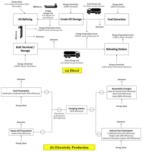Figure 4a depicts diesel storage, transport, and dispensing. Power is used in storage to run fuel pumps and other loading devices because of the floating roofs installed on Morocco’s fuel storage tanks to prevent evaporation and operational losses. The GREET model uses these data as the amount of energy needed to load/unload 1 MJ of the related fuel. Trucks deliver fuel within the kingdom. Finally, vehicle emissions models account for energy used in station refueling and evaporation wastes owing to pump slits and inefficiencies. Energy losses were modeled to account for pump fuel spills.