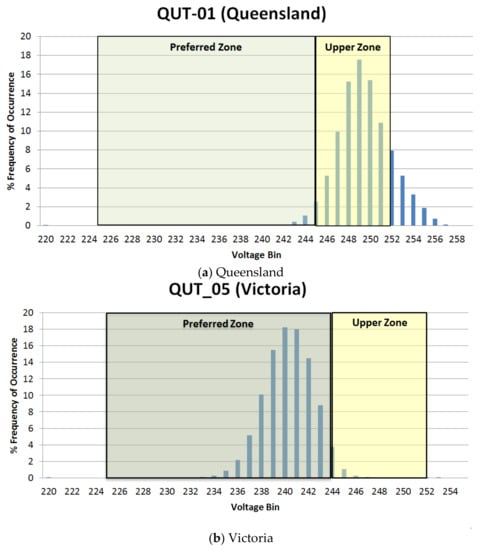An example voltage distribution compared with lower, preferred and upper operating zones required by the Australian 230 V standard is shown in Figure 1. In contrast to the European adopted EN50160 that requires 230 V ±10% for 95% of time, in Australia the upper (+10%) and lower (−6%) of the 230 V standard is based on the 99th percentile. This means that voltages (over a 10 min average) can exceed the upper and lower limits only 1% of the time under normal network operation. In addition to these point-of-supply voltage standards, AS/NZS 3000 Wiring Rules allow for an additional 5% voltage drop to occur between the point of supply and the point of use within a customer’s premises. Exported energy from rooftop PVs is widely reported to cause voltage rise, particularly at times of high solar radiation and low load, due to the export of real power and the impedance of the system.