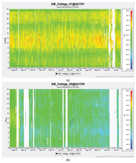To examine the voltage variations in more detail, MoniSOFT was used to create carpet graphs for each case study (Figure 4a–d): the x axis represents time over the year (1 August 2015–31 July 2016) and the y axis represents hours of the day (0–24). Green areas indicate consistent voltages within the standards whereas yellow to red areas indicate voltages outside of the standard (higher than the standard). These graphs show how voltage varies throughout the day. Note that this specific analysis was carried out using 30 min averages to enable correlation with other data sources: Australian revenue meters (electricity meters for billing purposes); solar radiation data from the Bureau of Meteorology; and electricity industry practice of demand charges being determined at half hour intervals. Some interesting findings from these figures are highlighted below: