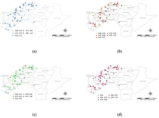 The average score of the area ratio and distribution of pond water surfaces covered by aquatic plants was 1.88, which is substantially lower than the calculated value of vegetation coverage on pond banks and implies that there were more aquatic plants growing along the pond banks than actually covering the water surfaces. For example, more than 70% of ponds show the trend, where less than 25% of the ponds’ water surfaces are covered by aquatic plants and/or vegetation that does not grow along pond banks. Furthermore, there were three study sites that earned a full score (5) for this evaluating criteria. The final weight coefficient of the water depth of the farm pond; vegetation coverage on the pond banks; and the area ratio and distribution of pond water surfaces covered by aquatic plants were 0.105, 0.102 and 0.098, respectively (Table 2). The aquatic environment value was calculated by using the final weight coefficients multiplied by the indicators’ score. The range of the aquatic environments value was 0.3–1.42. Ponds with high aquatic environment values were located in the northern townships, including Dalin, Sikon, Singang and Lioujiao townships (Figure 3a).