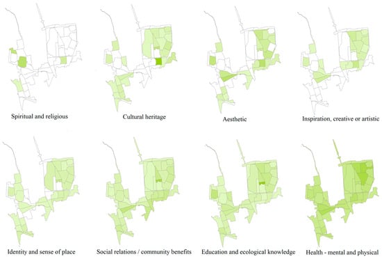 Maps of singular cultural benefits perceived by citizens. Increase in intensity indicates an increase in the number of marks.