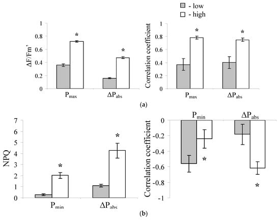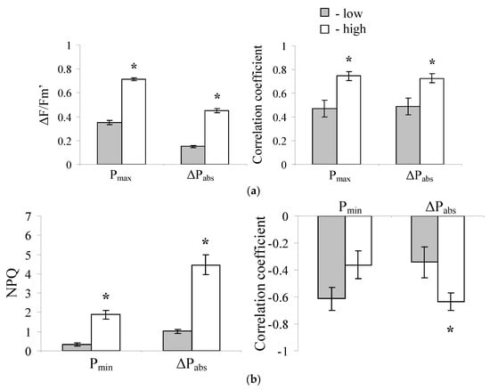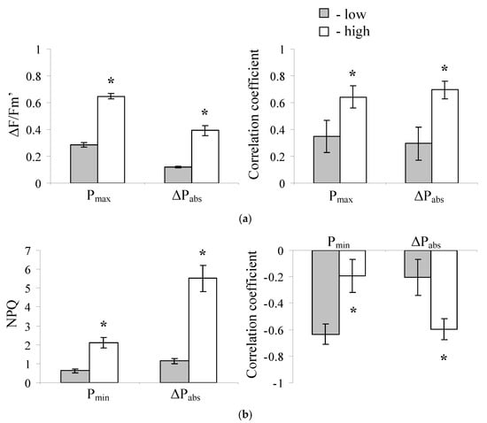 Under sunlight, we observed dependencies of correlations of PRI with ΔF/Fm’ and NPQ on Pmax or Pmin and ΔPabs (Figure 6a,b). Correlation coefficients of PRI with LUE did not significantly differ in groups with different Pmax and ΔPabs (Figure 6c). Similar trends were observed under artificial light (Figure 7). However, significant differences were shown only between correlation coefficients of PRI with ΔF/Fm’ in groups with low and high Pmax of the quantum yield of photosystem II. It should be noted that absolute values of correlation coefficients of PRI with NPQ and ΔF/Fm’ under artificial light (about 0.6–0.8) were higher than ones under sunlight (about 0.2–0.7).