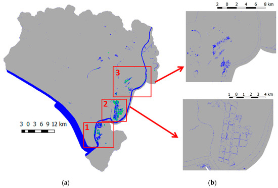 In order to compensate for the uncertainty caused in the validation due to the lower spatial resolution of the Landsat-derived inundation maps, two validation results are presented: in Situation (i), boundary regions between inundated and non-inundated pixels are excluded from the accuracy estimation, and in Situation (ii), boundary regions are included. Pixels in the area corresponding to sea coastal waters are not taken into consideration to obtain unbiased classification results. Landsat inundation maps are comprised of the water class and the non-water class. The boundary regions in the Landsat mask are comprised of pixels including in their eight closest-neighbor pixels at least one pixel of a different class. Figure 13a shows a map including the boundary regions and Figure 13b a zoomed region of it.