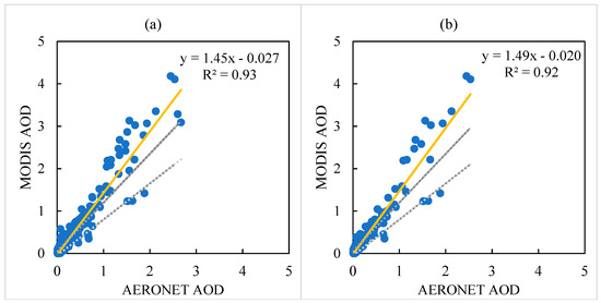 - Criterion 3: At least 67% of the MODIS AOD versus AERONET AOD datasets must lie within the EE. The value of 67% was selected based on the findings of Remer et al., in which 68% of the retrievals at 550 nm fit within the EE, and the fact that the prelaunch expectation was 66% [31]. It was also used in the validation study by Sherman et al. [19].