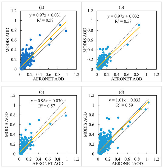 Spatially and temporally collocated MODIS and AERONET AOD measurements were obtained from the MAPSS. In MAPSS, AERONET AOD measurements taken within 30 min before or after the satellite overpass time were considered temporally collocated with the MODIS measurements. This was consistent with the previously described methods of temporal collocation [19,23,25]. MODIS pixels in MAPSS were sampled if the distance between the AERONET site and the MODIS pixels did not exceed 27.5 km [23]. Terra AOD was used only if the mode QA of the collocated product was 3, and Aqua AOD was used only for products with QA of 3. In MAPPS, the QA of 3 could only be specified for Aqua and not Terra at the time of the analysis; thus, Terra AOD was selected based on a mode of QA 3. The minimum number of collocated AERONET and MODIS pixels was set as one to increase the number of coincidences as described in the validation study by Sherman et al. [19].