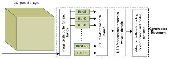 A multispectral image is a 3D matrix and fundamentally includes both spatial redundancy and spectral redundancy. The multispectral compression aims at removing both redundancies. Figure 1 shows the general principle for multispectral compression using NTD approaches. The NTD-based compression method involves three steps. In the first step, a two-dimensional (2D) transform (e.g., 2D-DWT and 2D-DCT) is utilized to remove spatial correlation in intra-band. In the second step, all transformed bands form a three-dimensional tensor. After that, a Tucker Decomposition is applied to the three-dimensional tensor to generate a core tensor and several factor matrixes. In the last step, an adaptive arithmetic encoder is used to process the core tensor and factor matrixes.