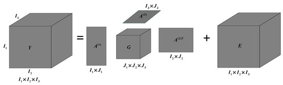 where is an estimation error of tensor in the decomposition process, and is an equivalent tensor (i.e., approximately evaluated tensor) using the generated core tensor and factor matrixes. Figure 2 shows the graphic illustration of the Tucker Decomposition of Equation (1) on the three-dimensional tensor.