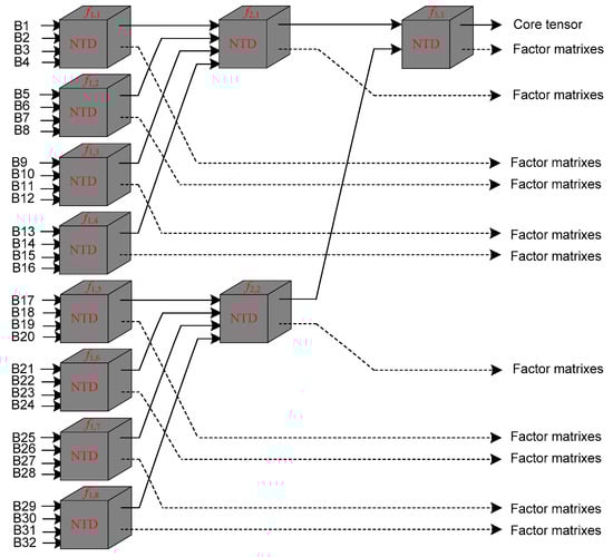 In the NTD channel, we use a multilevel decomposition (MD) method to implement the fast NTD method. Here, we take the band number of 32 as an example to demonstrate the MD principle. Figure 5 shows the MD principle when the band number is 32. The process level number is 3. In the first level, there are eight sub-tensors. Each sub-tensor is processed by TD to produce core tensor and three-factor matrixes. In the second level, every four core tensors produced in the first level are considered as a new tensor. There are the regrouped tensors. Each tensor is processed by TD. In the third level, the two core tensors produced in the first level are considered as a new tensor, which is processed by TD. Finally, one core tensor and several factor matrixes are produced.