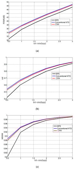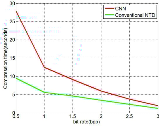We discuss the proposed method from the following aspects, which is shown Table 6. As shown in Figure 8, Figure 9 and Figure 10, the compression performance of the proposed method was slightly lower than the traditional NTD. However, the proposed method improved the computation efficiency by 49.66%. In the traditional NTD method, the whole spectral tensor is directly decomposed by the NTD algorithm in the DCT domain. In the proposed method, the whole spectral tensor is processed from two compression steps. The first compression step is that the CNNs transforms a large-scale spectral tensor into a small-scale spectral tensor. The second compression step is that the NTD is applied to the small-scale spectral tensor. These two steps achieve a high compression performance. The sacrificing PSNR is firstly from the first step because the NTD and inverse NTD do not include the self-learning network. This is done because we consider the high calculation complexity of the NTD and inverse NTD. The sacrificing PSNR is also from the multi-level NTD. We also tested the compression performance of the CNNs with NTD and inverse NTD. We found that the compression performance was basically the same as the traditional NTD method. However, the calculation complexity was very high. Our current method performed a tradeoff between compression performance and complexity.