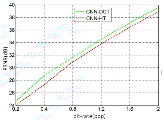 In the CNNs, the DCT and entropy encoder is used because our compression algorithm uses the DCT as the sparse representation tool and the entropy encoder as the entropy coding. In the self-learning network, we also use Hardmard Transform (HT) to replace the DCT. After obtaining the small-scale spectral tensors, we still use the DCT and NTD to remove the spatial and spectral correlations. We also multispectral images to perform the experiments when the different learning networks are used. Figure 11 shows the comparison of two different learning networks. The experimental results show the use of the HT-based CNNs obtained a lower PSNR (i.e., lower compression performance) than the proposed method. Thus, the sparse represent method and entropy encoder in the convolution neural learning network need to keep the same to the latter stage of the compression methods.