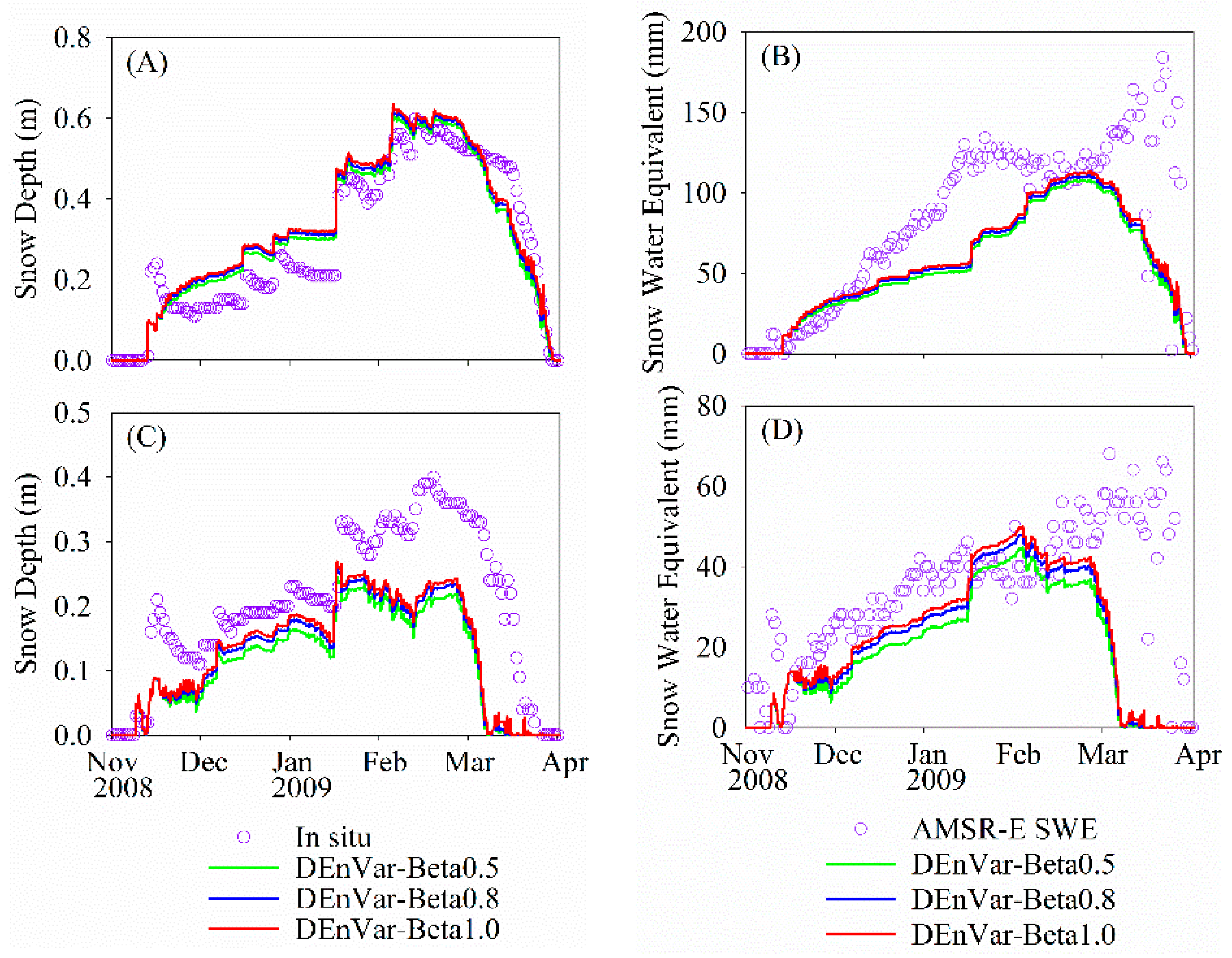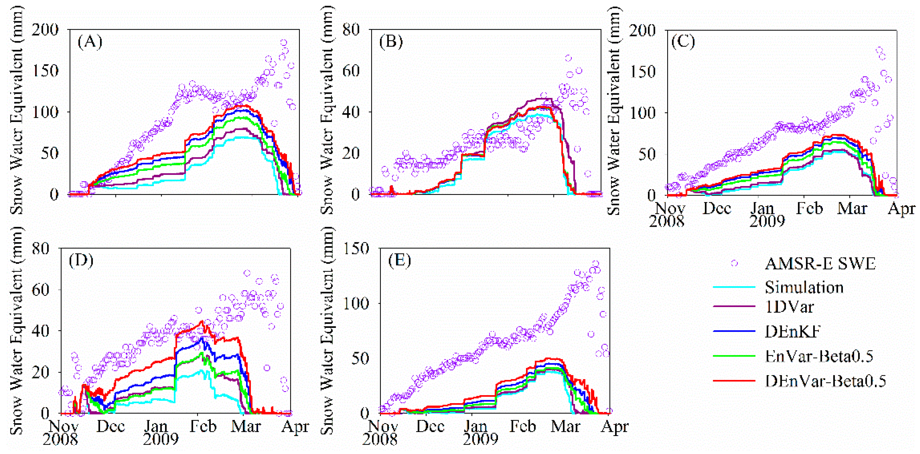 | DEnVar-Beta 0.5 | Snow DA using the proposed hybrid method with ensemble size of 25, weighting coefficient of 0.5 in Equation (11) |