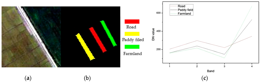 The multispectral images. (a–c) the true/false color map, the ground reference map and the corresponding spectral curves of ground truth classes of QuickBird datasets; (d–f) the corresponding maps of Landsat TM datasets; (g–i) the corresponding maps of Landsat ETM+ datasets; (j–l) the corresponding maps of GaoFen-1 datasets; (m–o) the corresponding maps of FLC1 datasets. (a) True color map; (b) false color map (7, 5, 3); (c) false color map (7, 5, 3); (d) true color map; and (e) false color map (bands 12, 9, and 1).