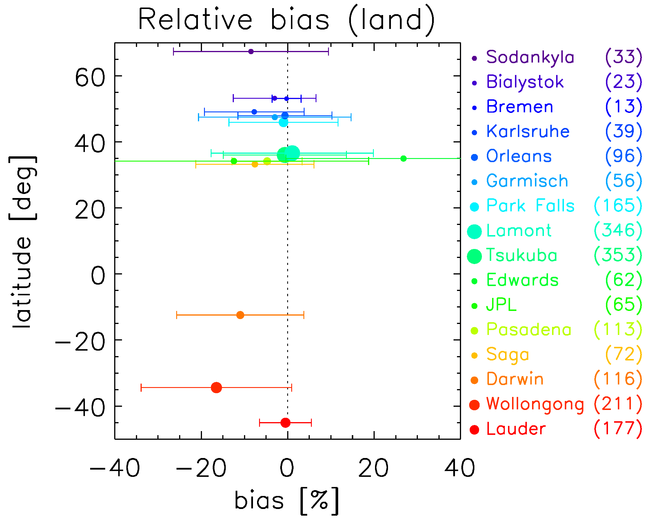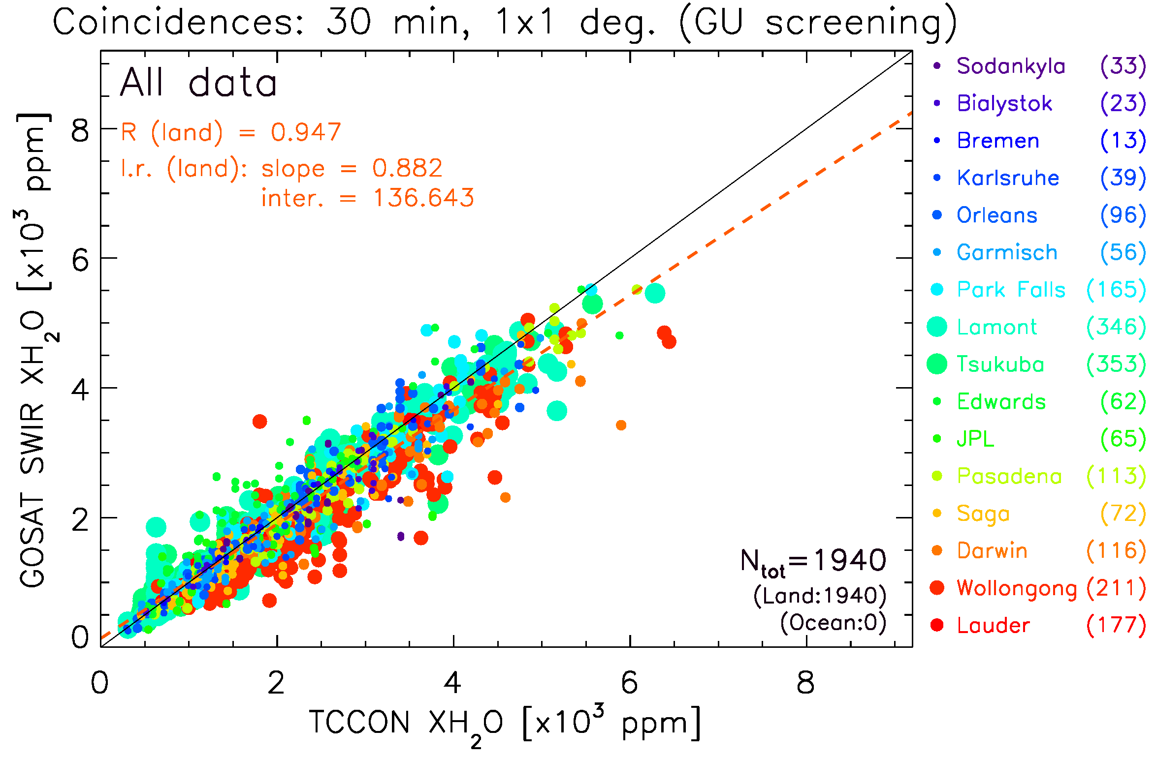 - We use the ground-based TCCON data as the reference for the calculations. The absolute bias for one pair (GOSAT vs. the mean of matched TCCON, “single-scan bias”) is thus defined as and the relative bias as the absolute bias ratioed to the TCCON values: . Here, represents the arithmetic mean of from all TCCON soundings coincident with one GOSAT scan. We then compute the corresponding global bias (absolute or relative, “ensemble bias”) as the arithmetic mean of the single-scan biases (absolute or relative) with its associated standard deviation. In order to evaluate the overall consistency of the results for different TCCON sites, the average and standard deviation of the station mean biases are also calculated (“station bias”). The linear least-squares fitting parameters and the correlation coefficient (R) are determined for the ensemble set and for each TCCON dataset.