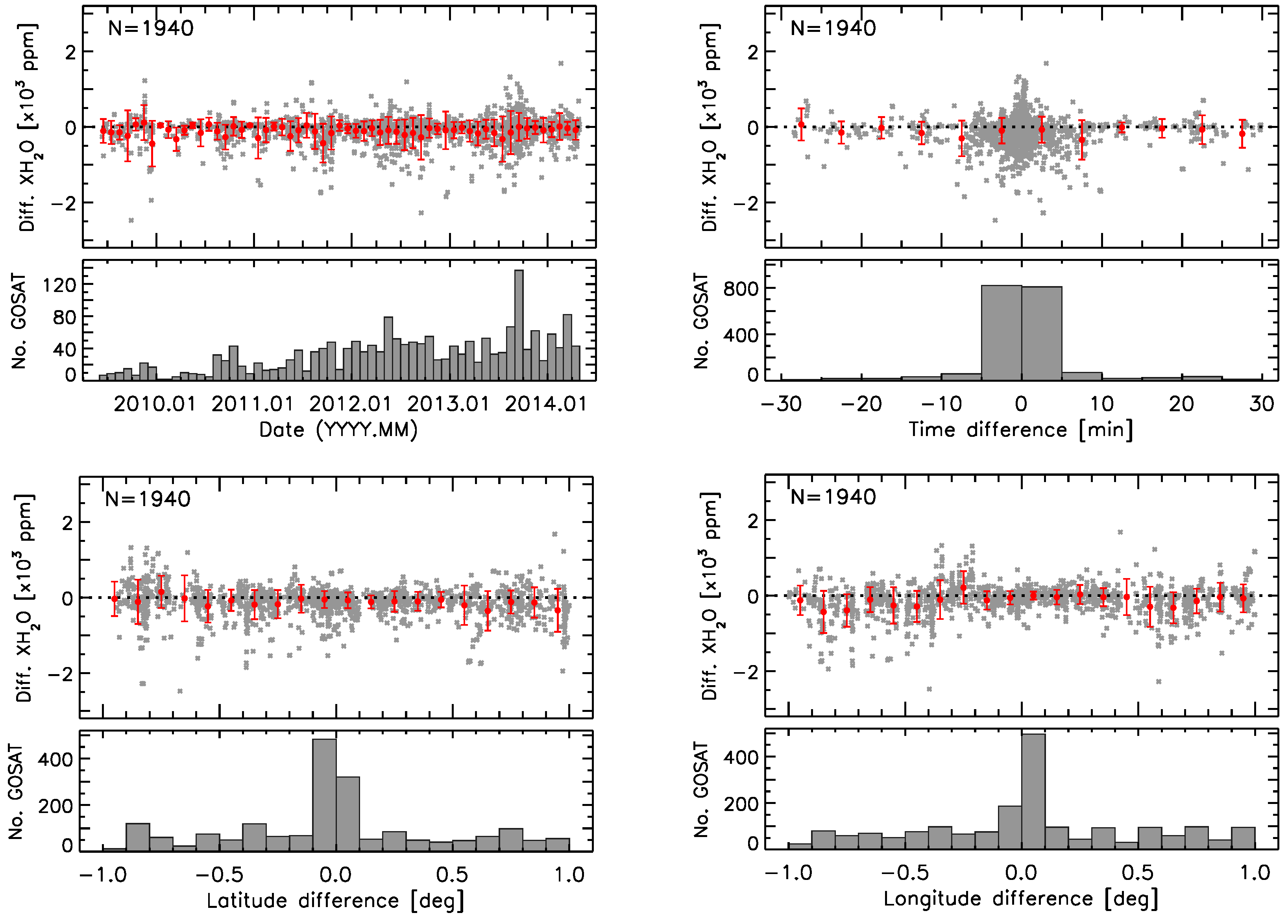 - Discrepancies between the mean altitude within a TANSO-FTS footprint and the elevation of the TCCON sites potentially have a significant impact on the results. This is particularly true for water vapor, whose column abundance is largely dominated by its lower-tropospheric amount. Here, we also assess the impact of the GOSAT/TCCON altitude differences on the XHO bias, but for simplicity reasons, we do not apply any altitude compensation to the GOSAT or TCCON columns prior to the bias calculations.
