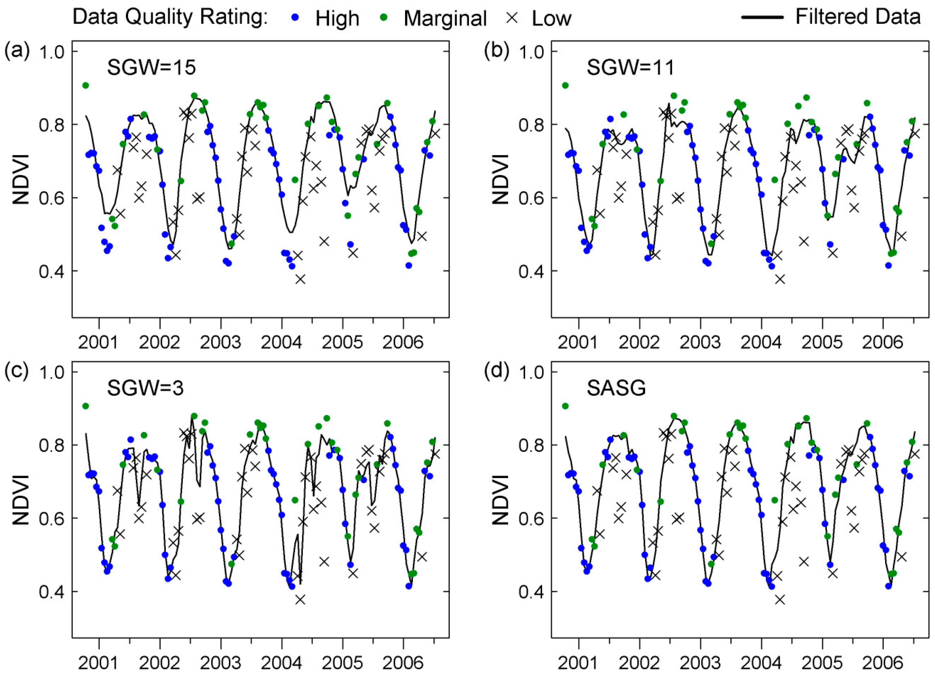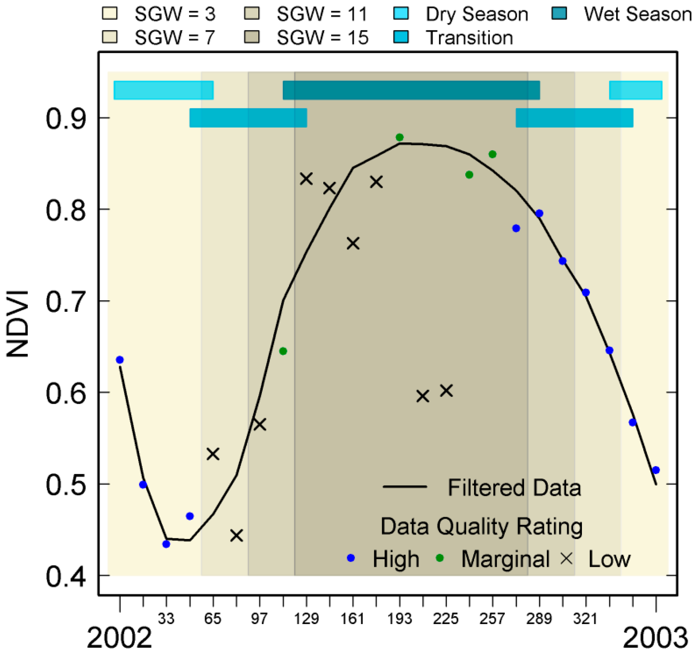 - Jönsson, P.; Eklundh, L. TIMESAT—A program for analyzing time-series of satellite sensor data. Comput. Geosci. 2004, 30, 833–845. [Google Scholar] [CrossRef]