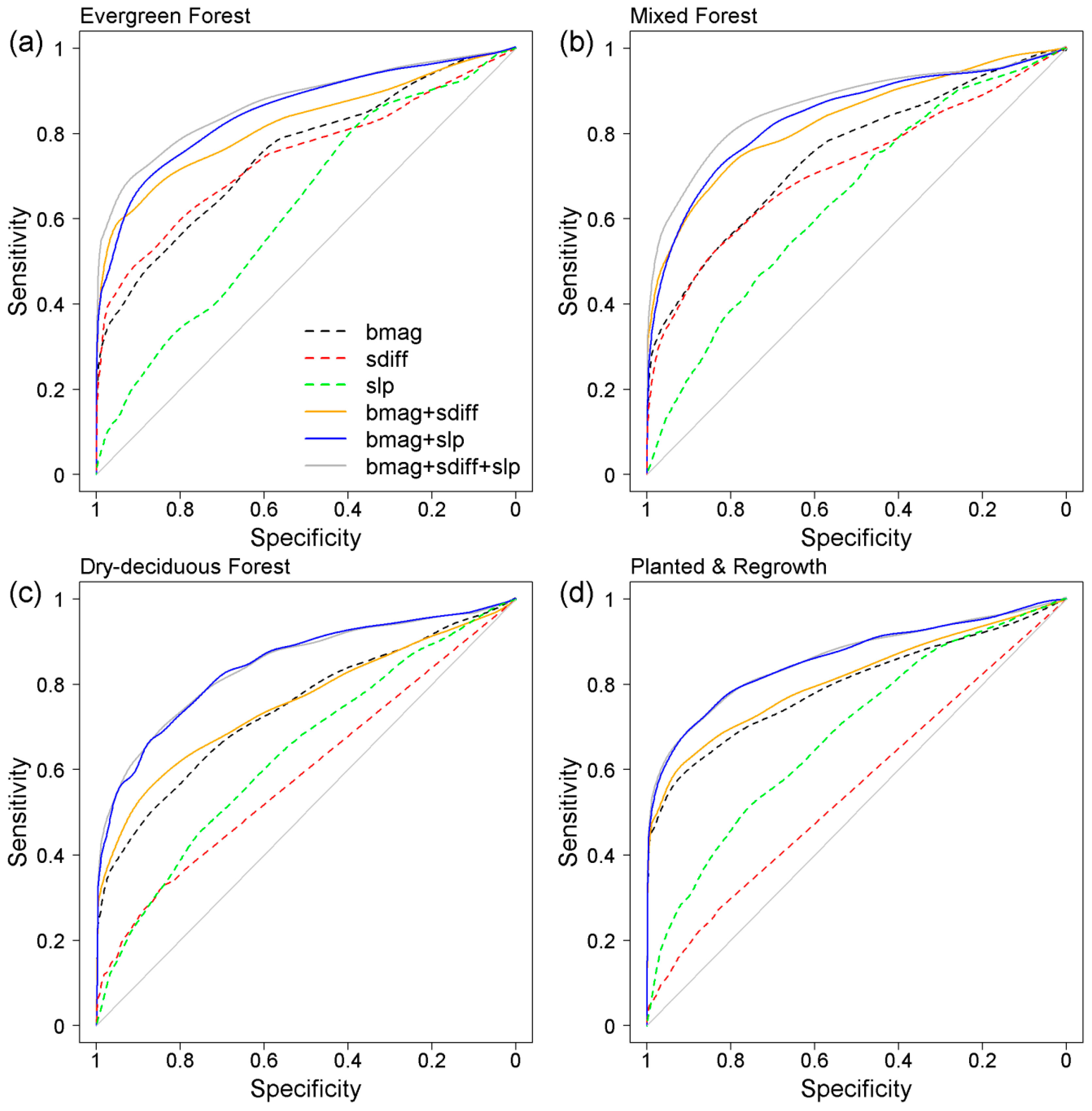 - It is reasonable to assume that specialized models outperform more general models, but it is not clear to what degree this is true with respect to forest types. Since a forest-type specific approach would require additional inputs, a generalised approach may be preferable for large-area mapping if accurate enough. Is it beneficial to map forest changes separately by forest type or is a single generalised change model sufficiently accurate?
