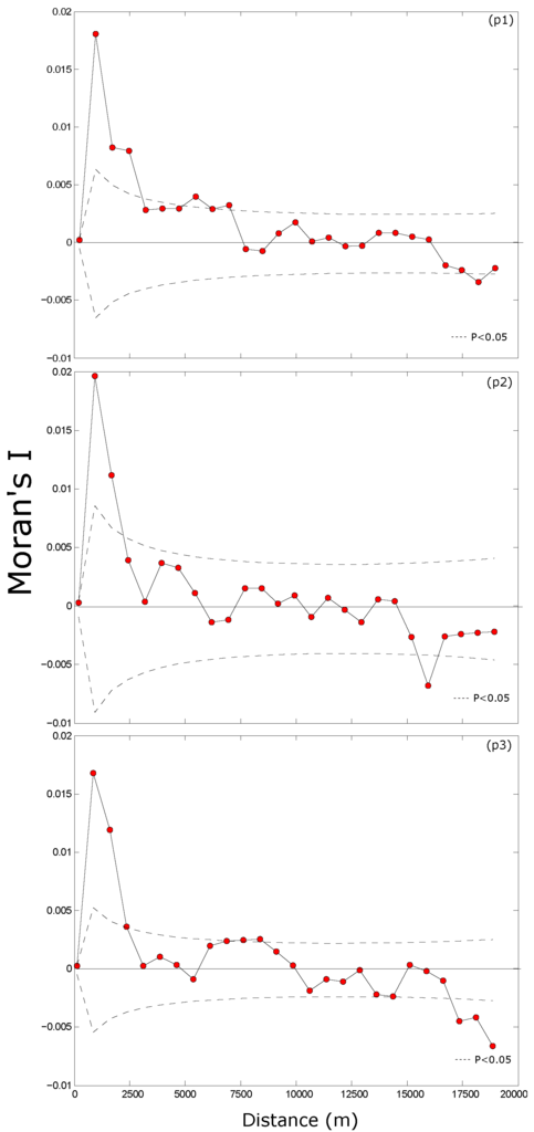 In order to characterize the range of magnitudes of the spatial autocorrelation, Moran’s Index was used for each plot (p1, p2, p3). The three correlograms are very similar and significant at low distances () (Figure 3). The main conclusion is that Moran’s Index decreases with distance and is non-significant beyond 2500 m.
