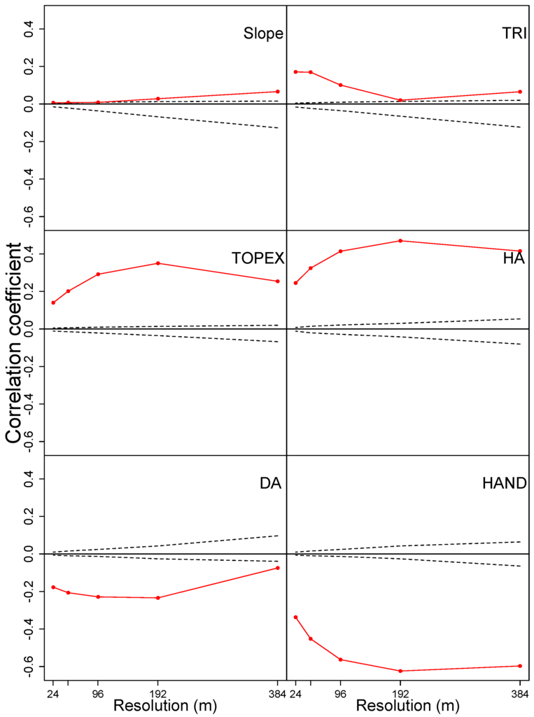 We calculated confidence intervals for the null hypothesis of no correlation (: r = 0) using Monte Carlo methods. Specifically, we randomized one of the processes, in our case the DCM (canopy height data), in a way that preserves the same probability density function as the original template and also preserves the autocorrelation function. From Monte Carlo simulations, we generated 999 Dual-Tree Complex Wavelet Transform (DT-CWT) data surrogates for the DCM and environmental variable (in a quadrat subset) to determine the p-value of the null hypothesis. DT-CWT, is an improvement on classical discrete wavelet transform techniques that is immune to shift dependence, i.e., major variations in the distribution of discrete wavelet transform coefficient energy over scales and orientations caused by small integer displacements of the pattern. DT-CWT also has the advantage of a better distinction and reproduction of possible pattern directions. We then compared the correlation between the observed DCM and environmental variables with the confidence interval generated from these surrogates. In the case of Pearson’s product-moment correlation coefficient, which may vary between −1 and 1, the test is two-tailed, and we consider the proportion of simulations for which the correlation falls outside the interval where is the observed Pearson’s correlation coefficient. Because hydrological and topographic variables are structured at multiple scales, and in order to assess the importance of the spatial scale in shaping the link between forest canopy height and environmental drivers, we apply the test to the grids re-sampled at six different resolutions: 1024, 512, 256, 128, 64, and 32 pixels, which correspond to 6, 12, 24, 48, 96, 192, and 384 m per pixel, respectively. Conversion to larger pixel size was done by using the “aggregate” function of the Raster package, using the mean height estimate.