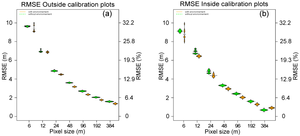 RMSE values generally decreased from 6 m to 384 m, from RMSE = 8.7 m to RMSE = 0.91 m (Figure 5b), with environmental covariates and from RMSE = 9.12 m to RMSE = 0.68 m without. Environmental covariates slightly improved the prediction accuracy, except for a pixel size of 384 m (Figure 5b).