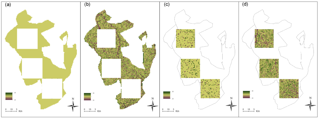 (a) DCM map derived from Kriging method outside plots without environment; the canopy height is equal to the average predicted values; (b) DCM map derived from Kriging method outside plots with environment; (c) DCM predicted with Kriging method inside plots without environment; (d) DCM predicted with Kriging method inside plots with environment
