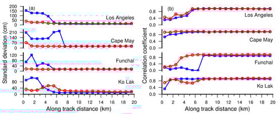 Along-track standard deviations (left column) and correlation coefficients (right column) between various retracked SSHs and tide gauge within 20 km offshore. Each node is computed using the SSHs within the corresponding zone of 1 km in width. Study region is arranged in row: (a,b) Los Angeles, (c,d) Cape May, (e,f) Funchal, (g,h) Ko Lak.