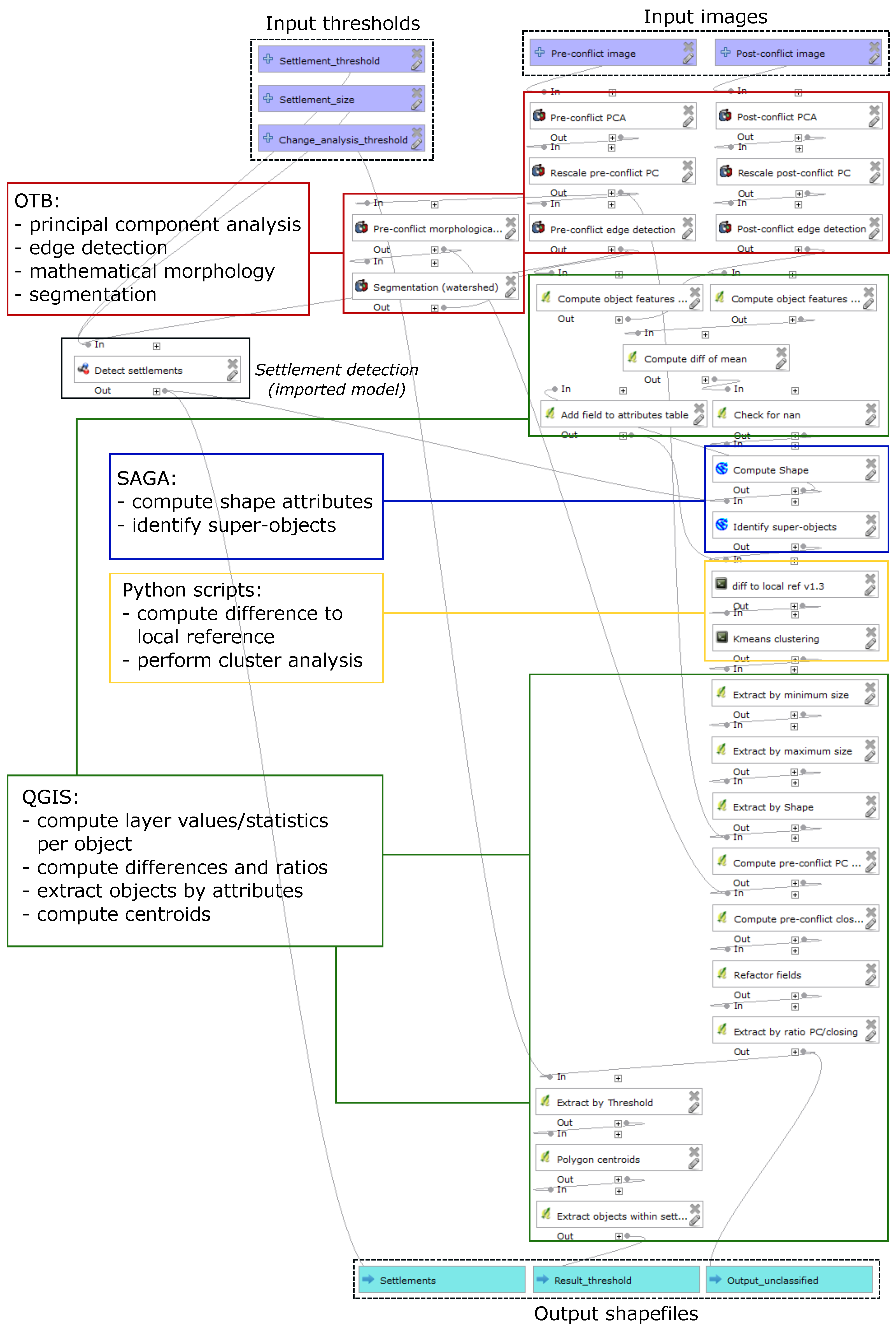 | Calculate difference in mean edge density between pre- and post-conflict (check for NULL) | QGIS:Adv. Python Field Calculator QGIS:Extract by attribute | Change analysis |